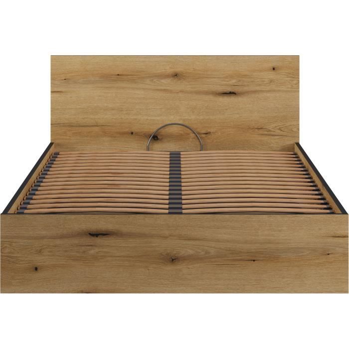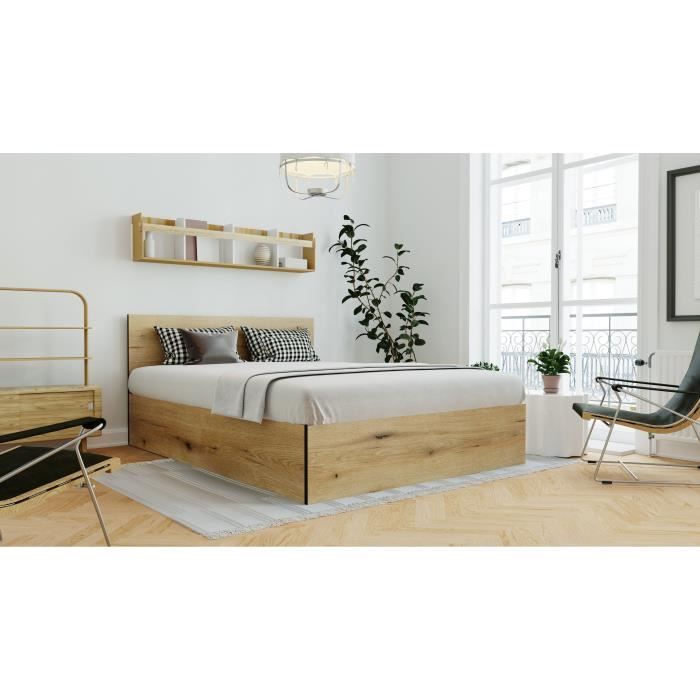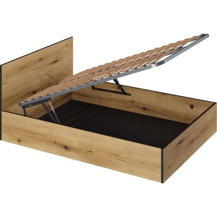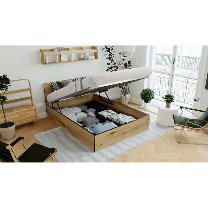 Ce lit coffre en bois de couleur Chêne Rustique est idéal pour une chambre a coucher de style industriel - loft. Il est équipé d'une tête de lit et d'un sommier a lattes inclus.