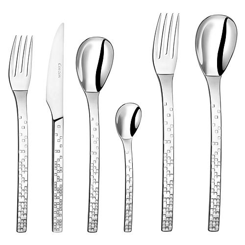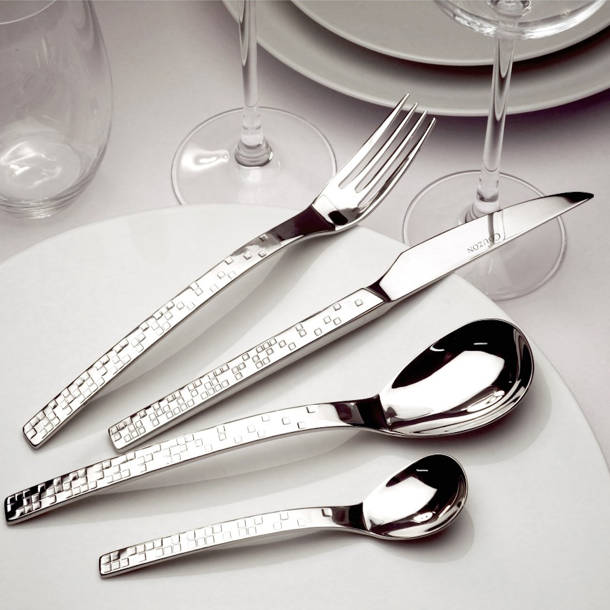 L’élément phare de cet ensemble ? Le couteau "standing knife", qui se distingue par sa capacité à tenir debout sur la tranche. Ce détail original et élégant transforme chaque repas en une expérience visuelle raffinée. L’ensemble comprend 12 fourchettes, 12 cuillères de table, 12 cuillères à café, 12 couteaux et 2 couverts de service, pour un service complet de 12 personnes, idéal pour les grandes tablées ou les réceptions.