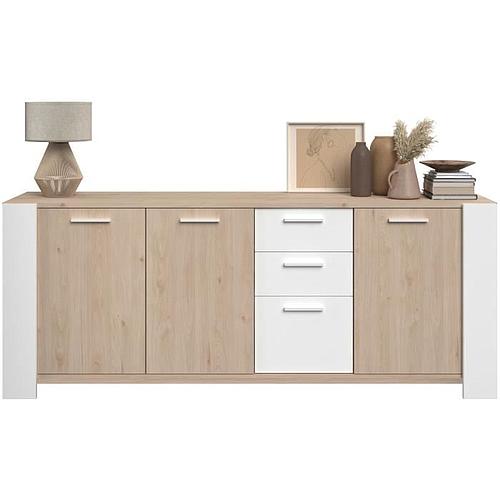 Ce buffet bas chêne/blanc 3 portes – 3 tiroirs est un meuble moderne et fonctionnel qui apporte à votre intérieur une touche de style scandinave tout en offrant une grande capacité de rangement. Avec son design épuré et ses finitions bicolores, il s’intègre parfaitement dans un salon ou une salle à manger contemporaine, tout en restant pratique au quotidien.