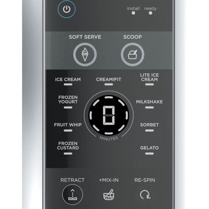 Accessoires inclus : base motorisée, 2 pots avec embouts et couvercles, couvercle de distribution, bol externe et couvercle, pale Creamerizer, plateau d’égouttage, livret de recettes