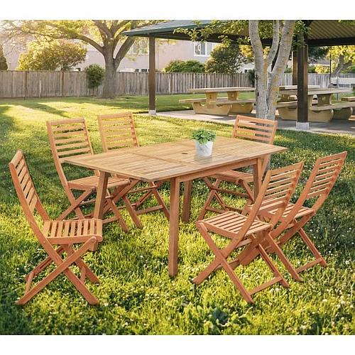 Description du produit Table extensible 120/180 x 80 x H.74 cm + 6 chaises pliantes 53 x 48 x H.92,5 cm