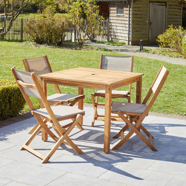 In your small garden or on your terrace, this acacia wood set with a convivial square table for 4 people and 4 comfortable folding chairs in gray textilene will make you spend pleasant moments. A set full of charm and what's more, timeless.