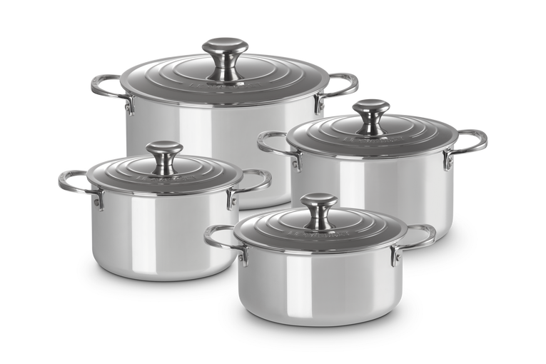 batterie de cuisine polyvalente comprend : trois cocottes de 18 cm/ 20 cm/ 24 cm de diamètre et un faitout de 20 cm de diamètre. Grâce à leur fabrication spéciale en inox scintillant 3 couches, la diffusion de la chaleur est uniforme pour la réalisation de plats délicieux et savoureux.