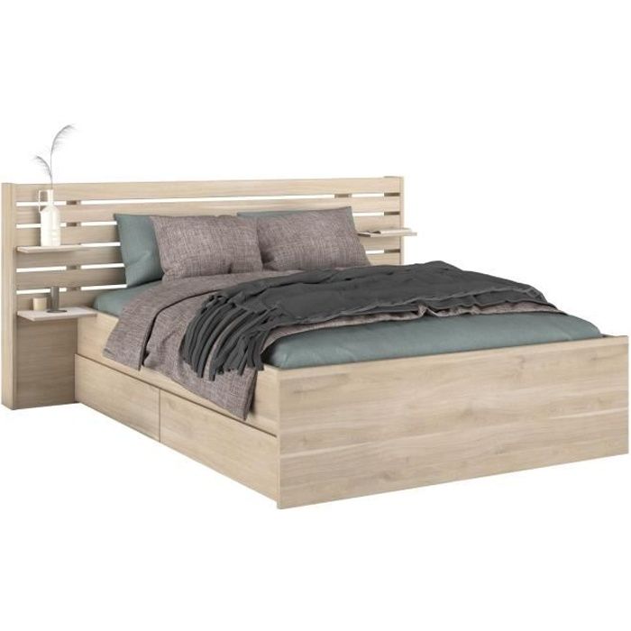 Le Lit 140x190/200 cm avec rangements est une solution pratique et élégante pour optimiser l'espace dans votre chambre. Fabriqué en France, ce lit est conçu avec une structure en panneaux de particules d'une épaisseur de 15 mm et une finition en papier décor imitation chêne, facile à entretenir avec un simple chiffon doux.