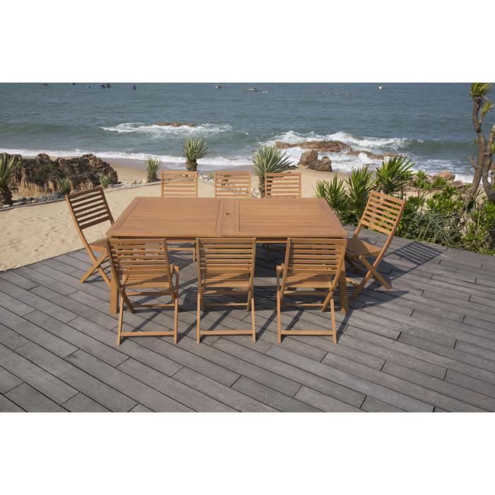 Cet ensemble de repas de jardin contient 1 table extensible et 8 chaises pliantes en bois d'eucalyptus FSC, confort et convivialité sont les aouts de ce salon de jardin.