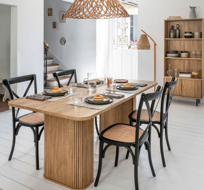 La table s'intègre parfaitement avec le métal, le verre et le velours, tandis que les chaises Isak apportent une touche vintage rustique avec leur structure en chêne et assise en rotin. Ensemble, ils créent une ambiance chic et accueillante.